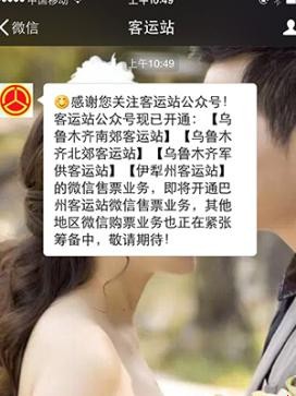 用手机搜索微信公众号中的“客运站”,搜索栏第一位显示出新疆客运站的公众号。添加后,跳出一条推送信息,显示已开通乌鲁木齐南郊客运站、北郊客运站、军供客运站、伊犁州客运站的微信售票业务,即将开通巴州客运站微信售票业务,其他地区微信购票业务也在筹备中。
