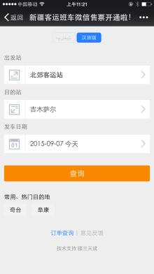“我们将全疆多家客运站放到一个公众号里操作,方便旅客购票。”新疆楼兰天成网络科技有限公司微信平台负责人赵强介绍,该微信购票平台首次使用双语操作,在全国微信售票系统中尚属首例。