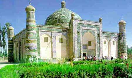 香妃墓,在城东北5公里处,周围池水如镜,绿树参天,塔楼辉映,画柱雕梁,是座独具一格的维吾尔式古建筑。它的顶部,如倒扣的铁锅,下边却是方方正正,外表全为湛蓝、碧绿、金黄各色琉璃砖瓦镶砌。远远望去,五彩斑斓,耀眼夺目,宛若一座宏伟高大的宫殿。在一本游记中,曾作过这样的描写:“妃陵位于(喀什噶尔)东北隅,上圆下方,墙皆绿色花砖……宏敞壮丽,胜哈密回王陵寝数倍。中有坟墓数十,层叠环列。询守墓人阿浑,香妃何在,皆莫能对。惟谓大者男坟,小者女坟,皆香妃亲属。”