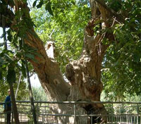 新疆和田千年核桃王位于和田县巴格其镇喀拉瓦其村内,距和田市区15公里。经考证,该树已有 560多年历史 ,当属元代的果树,堪称老寿星。历经数百年风雨沧桑,核桃王仍以其高大伟岸,枝繁叶茂,苍劲挺拔的雄姿,展现于游人面前,给游客一种深邃悠远 ,欢畅淋漓的美感。该树独占一亩天地,树高16.7米 ,树冠直径20.6米,主干周长6.6米,冠幅东西长21.5米,南北宽10.7米,树型大致呈"Y"字型, 整个大树主干五人合抱围而有余。由于年代久远,主树干中间已空,形成一个上下连通的"仙人洞",洞底可容纳四人站立。入口直径0.74米,出口直径 0.55米,可容游人从洞口进入,顺着主杆从树丫上端出口处爬出。细看树干皮色,粗糙而深沉,恢宏而古老,像画家笔下凝重苍劲的色彩,形状奇特,气势雄伟。更有趣的是离树王12米处其根又长出一 棵核桃树,形状酷似老树王,身躯也呈"Y"字型,只是树干无其母粗实,介也得两人才能合围。细看去,酷似一对情深意浓的人间母子,令游人感慨万分。核桃王如此古老,却叶肥果盛,年产核桃20000余 颗,所产核桃以个大皮薄,果仁饱满百著称,具有健身益肾,滋肝润肺,润肠健脾,延年益寿之功效。 目前,核桃王公园已成为和田地区重要的旅游文化景点之一。