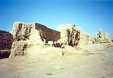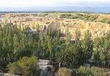 交河故城】位于吐鲁番市以西10公里处,南北长约1650米,东西最宽处约300米,因为两条河水绕城在城南交汇,故名交河。故城为车师人开建,建筑年代距今约 2000~2300年。故城由庙宇、官署、塔群、民居和作坊等建筑组成,总面积达25万平方米。交河故城是目前世界上最古老、最大也是保护得最好的生土建筑城市。1961年交河故城被定为国家重点文物保护单位。