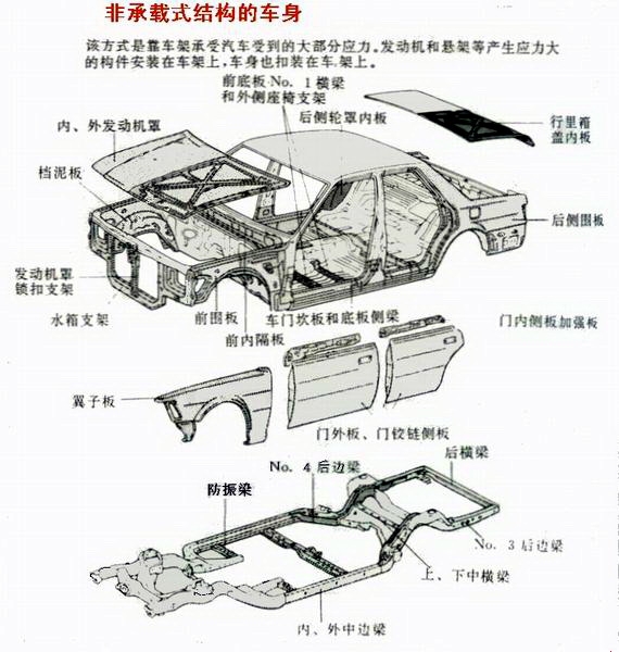 非承载式车身的汽车有刚性车架,又称底盘大梁架。车身本体悬置于车架上,用弹元件联接。车架的振动通过弹性元件传到车身上,大部分振动被减弱或消除,发生碰撞时车架能吸收大部分冲击力,在坏路行驶时对车身起到保护作用,因此车厢变形小,平稳性和安全性好,而且厢内噪音低。但这种非承载式车身比较笨重,质量大,汽车质心高,高速行驶稳定性较差。