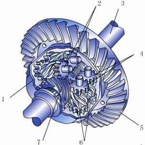 1-差速器壳;2-直齿轮轴;3-半轴;4-直齿轮;5-主减速器从动齿轮;6-蜗轮;7-蜗杆(两个)