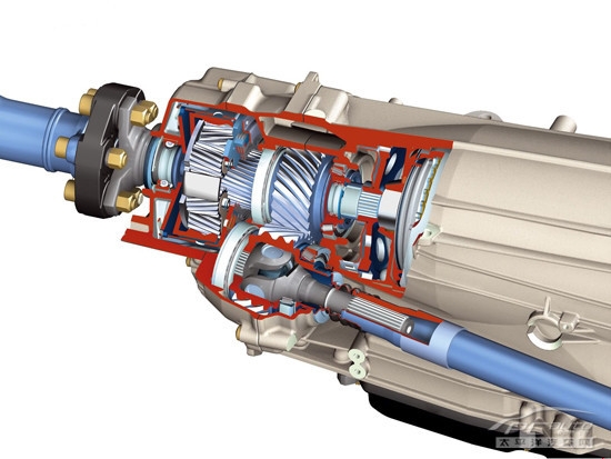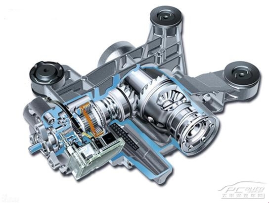 主动式限滑差速器 扭力感应式限滑差速器:它是将普通差速器的齿轮改成涡轮蜗杆,而安装位置和形式并不变。借由涡轮蜗杆传动的自锁功能(蜗杆可以向涡轮传递扭矩,而涡轮向蜗杆施以扭矩时齿轮间摩擦力大于所传递的扭矩,而无法旋转)来实现限滑功能。 限滑差速器的出现,不仅解决在城市道路中的问题,而且也为汽车到野外行驶提供了便利。特别是那些针对复杂环境推出的全时四轮驱动汽车(AWD),其中最有名的就数奥迪Quattro系统,正是奥迪的大胆创新并义无反顾才使得越来越多的人享受到了AWD带来的驾驶乐趣。奥迪Quattro的核心正是托森限滑差速器系统,谁能想到在电子部件横行的今天它还保持着机械的清纯。在正式开始讲解托森限滑差速器之前,咱们有必要来学习一个小知识。两轮驱动的汽车是安装有前后两个差速器,而四轮驱动汽车则安装有三个差速器,除分别控制前、后轮的两个以外,还增加了一个对前后轮进行扭力分配的中央差速器。托森差速器就是作为中央差速器来使用的,它巧妙地利用了涡轮蜗杆传动的不可逆性,即蜗杆可以使涡轮自由转动,而涡轮不能使蜗杆自由转动。当前后车轮转速一样时,与差速器外壳相连的六个涡轮,它们一起驱动分别与前传动轴和后传动轴相连的两个蜗杆共同旋转。当前轮和后轮的转速不一样时,它们会导致一侧的三个涡轮旋转并带动另一侧的三个涡轮跟着旋转。如果涡轮的转速不是很大,由于涡轮蜗杆传动的不可逆性,它不会对中间的蜗杆施加驱动力,从而可以吸收前后轮的转速差。但是,前轮或后轮空转打滑,也就是说转速差特别大的时候,涡轮与蜗杆间的摩擦就会增大,就会对蜗杆施加动力,从而驱动不打滑的后轮或前轮前进。这套系统最大的特点就是体积很小,可以将中央差速器与前轮差速器二合一的集成在变速箱里面,这样就为安装更大的发动机空出了空间,是奥迪汽车能够塞入V8甚至更加庞大的W12引擎的关键。这样做的最大好处就是不仅使汽车拥有了更高的性能,而且在不大幅降低车速的前提下,增加了车辆的安全性。