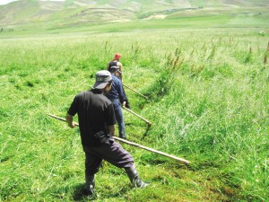上苏阿苏古遗迹背后的小山丘时,我们碰到了一家在这里打草的哈萨克族牧民。他们告诉我,“很久以前这里是有台阶的,可以走上去。而且以前墙就在这些草丛里,现在看不清楚了。”