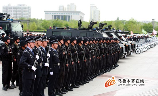 仪式现场,乌鲁木齐市公安局特警支队飞虎突击队队员和车辆出发。