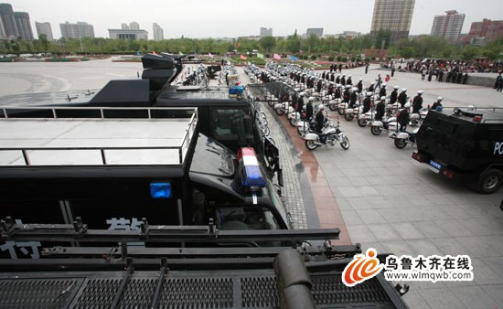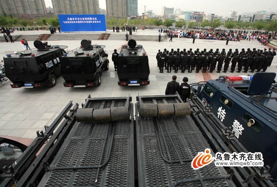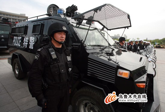 乌鲁木齐在线讯(记者刘青霞)在旋律激昂的人民警察之歌中,警灯闪烁,全副武装的特警队员驾驶新配发的特种车辆,摩托车原地待命,时刻准备出发。