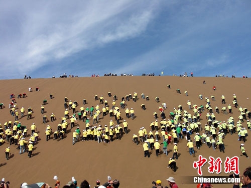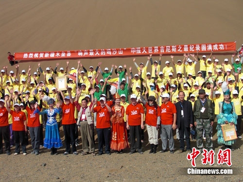 26日下午,在距离木垒县150公里的鸣沙山,上海大世界基尼斯总部理事、新疆总代理聂晶川先生宣布:根据前期测得的现场气温20摄氏度,湿度20%,沙面温度是28摄氏度的情况下,沙面离30厘米处测得的响声源监测值83.8分贝等各项数据表明,木垒鸣沙山荣获“世界最响鸣沙山”称号。
