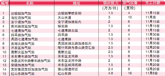 据市燃气办相关负责人介绍,新建的15座加气站共有110把加气枪,能够进一步缓解首府加气难的情况。其中,9座加气站可于11月15日前建设完工,陆续投入试运行。剩余6座加气站将于12月20日前完工。