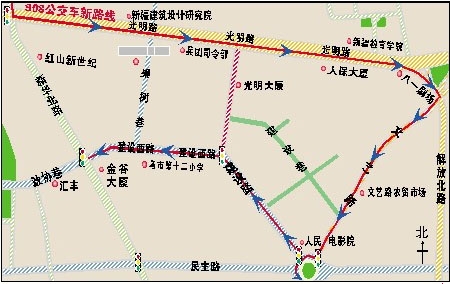 单行道通行方式实施后,公交908路上行线(西大桥往人民电影院方向)将沿光明路,途经北门环岛后,从文艺路驶回原线路。沿线将增加教育学院、文艺路两个公交车停靠点。