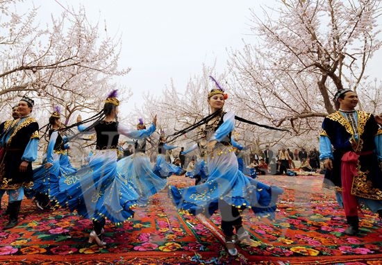 翩翩起舞的喀什年轻姑娘和小伙