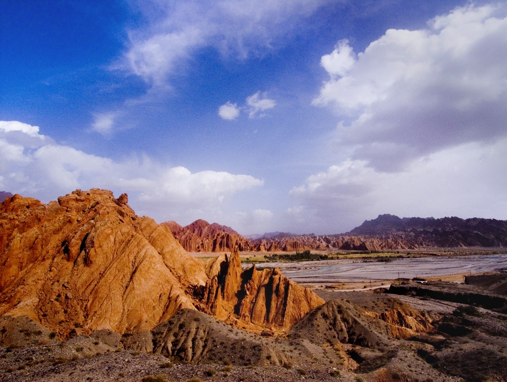 车沿着217国道向北行驶,左边是却勒塔格山,右边是蜿蜒的库车河。一路上单调的黄色让人有些昏昏欲睡。就像突然间闯进了一座恢宏的宫殿,当车转过一个急弯,每个人都被眼前都景象震惊了。一大片的古怪突兀都山丘,有些红得像火,有些黄得如金,交错叠堆,在夕阳下如同一座无声的古城。这是典型的雅丹地貌,库车大峡谷就在不远处了。