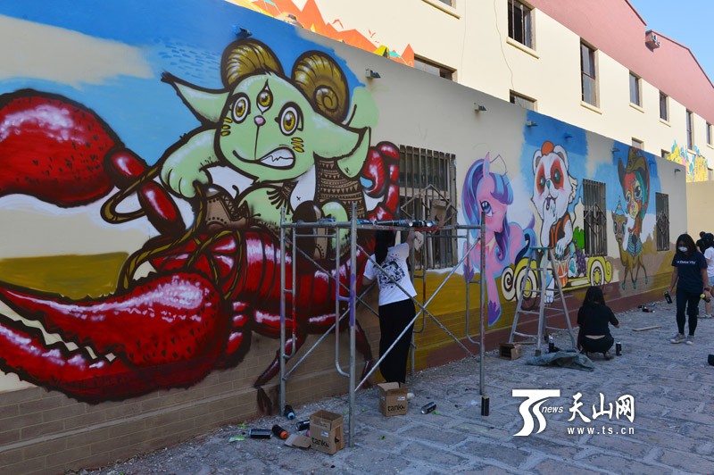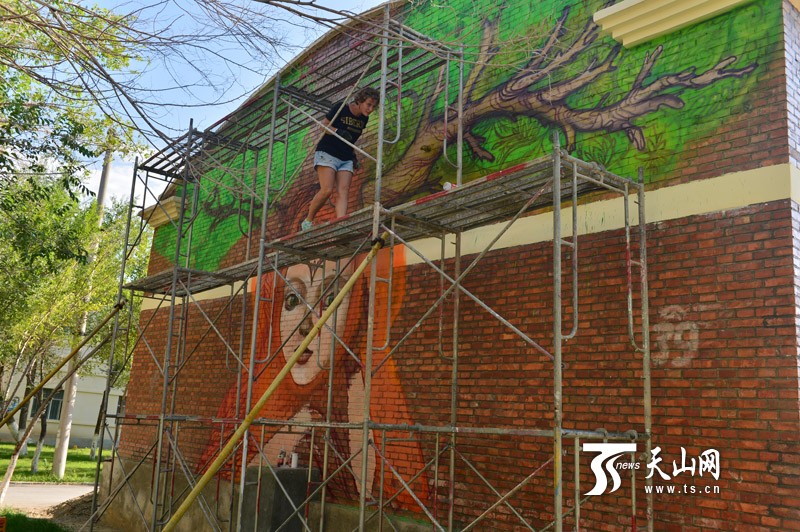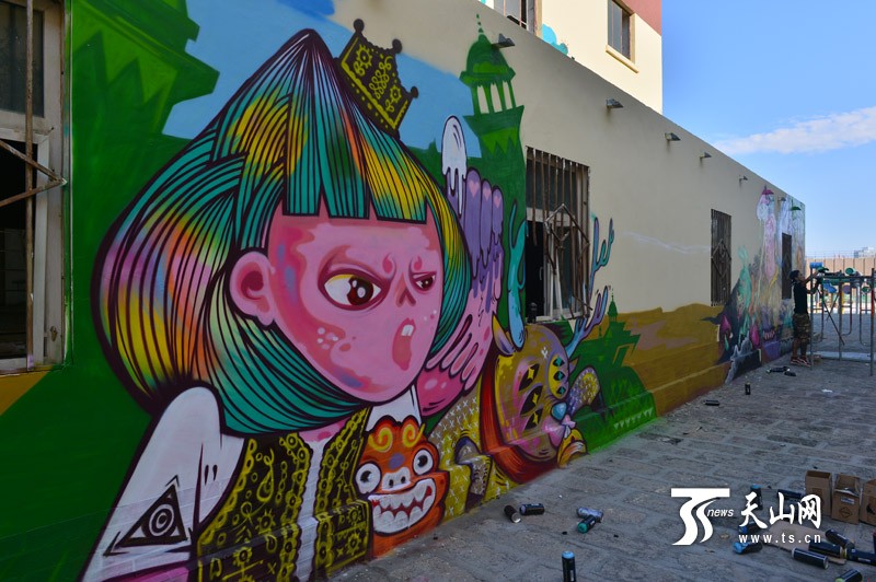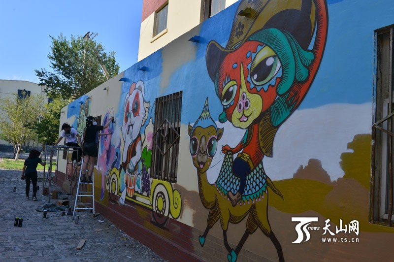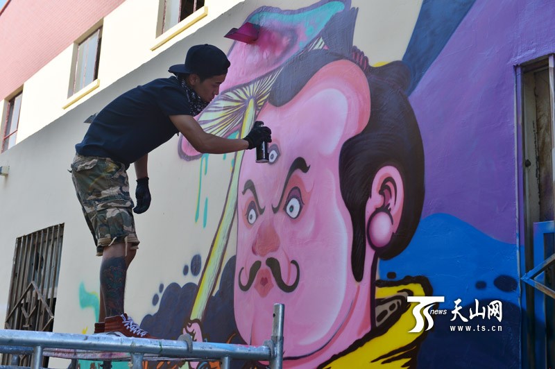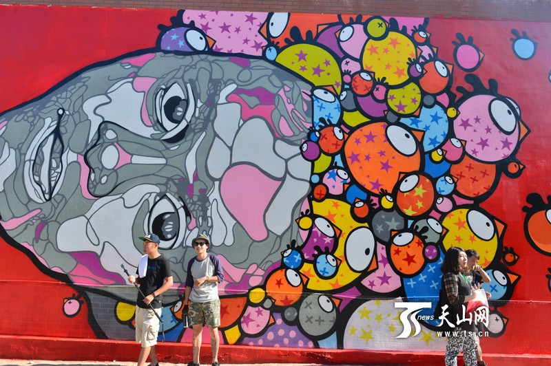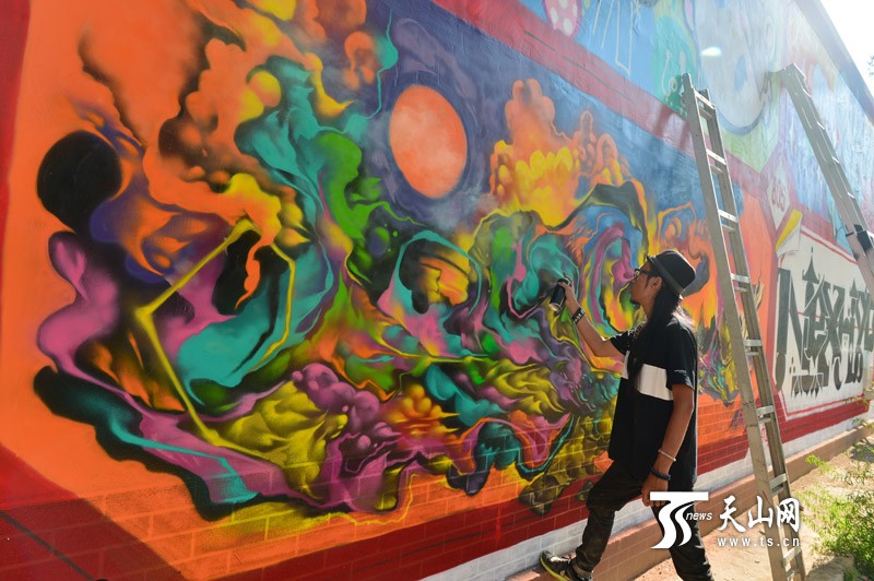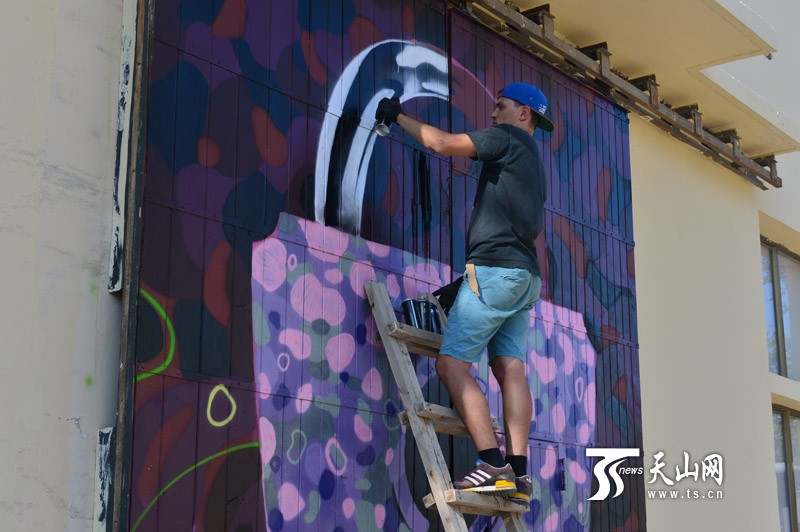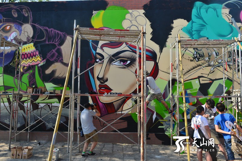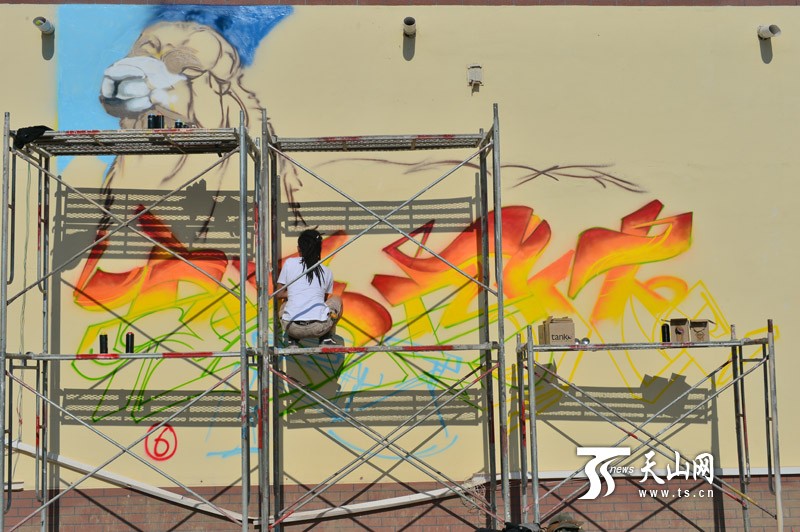 天山网克拉玛依讯(记者张新军摄影报道)8月7日,“丝涂之路”克拉玛依国际涂鸦大赛在克拉玛依市文化创意产业园举行,来自俄罗斯、法国、德国的涂鸦大师,以及广州、武汉、香港、台湾等国内30位涂鸦爱好者在近5000平方米的园区房屋外墙现场涂鸦创作。