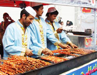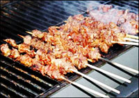 新疆维吾尔民间传统的串烤肉,同样既是街头的风味快餐,又是可以上席待客的美味佳肴。正宗的串烤肉也和烤全羊一样色泽焦黄油亮,味道微辣中带着鲜香,不腻不膻,肉嫩可口。用料的讲究不似烤全羊那样严格,二者的区别在于烤制规模的大小和具体方法上。 串烤肉,首先将净肉剔下来切成薄片,每一片有瘦有肥最好。然后将它们肥瘦搭配,一一穿在铁钎子上。过去,做串烤肉用的钎子 都是用红柳的细条截削而成的木钎。现在,这种原始的木钎不容易看到了。把肉穿好之后,便将它们疏密均匀地排放在燃着无烟煤的槽形铁皮烤肉炉子上,一边扇风烘烤,一边撒上精盐、孜然和辣椒面,上下翻烤数分钟即可食用。 近年来,在墨玉、库车和乌鲁木齐二道桥市场等地出现了串烤肉的另一种形式,民间称它为 “米特尔喀瓦普”,意为“1米长的串烤肉”。这种串烤肉确实名符其实,钎子足有70-80厘米长,肉块儿也大,立在馕坑里烘烤,一次可烤出十几串,味道鲜嫩可口,吃起来更为过瘾,因为这一大串足顶那小的7一8串烤肉。所谓炒烤肉,就是用上述那些调料用锅炒出来的羊肉片。 更为有趣、难得一尝的要数“肚子烤肉”。何谓“肚子烤肉”呢,就是把羊肚子洗净后,把羊肉剔下来塞进肚子里,再倒进些盐水把肉块拌匀,然后把口系牢,埋进用篝火烧热的沙子里烤熟的肉。烧烤的只是那肚子,肚子在这里真正成了“饭锅子”。人们尝了这种烤肉后都赞不绝口,说只有吃到这种肉时,才能享受到羊肉特有的、天然的鲜嫩香昧,那独特的滋味是任何其它方法烹制而成的肉食无法替代的,或许,这是最原始、传之最久远的食俗之一吧! |
