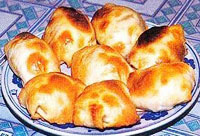 有趣的是,当薄皮包子蒸熟揭笼或烤包子从馕坑取出那阵子,厨师常常提高嗓门,拉着长声呼喊:“依布拉音·艾利克斯拉木包子哎……” 据说这个依布拉音·艾利克斯拉木是几百年前的名厨,他做烤包子、薄皮包子誉冠西城。于是,后人就拿他的名字作为招徕顾客的牌子。 烤包子面皮要擀得很薄,几乎可以透亮。肉馅主要用羊肉丁、羊尾油、洋葱末、孜然粉、胡椒粉、精盐和少量的水搅拌而成。包好的包子在笼里蒸20多分钟即熟。烤包子用未经发酵的面做皮子,皮子要擀得很薄,做成方形包子。馅用羊肉丁、羊尾油、洋葱、孜然粉、胡椒粉和盐搅拌而成。把包好的包子贴在馕坑里,十几分钟即熟。 在维吾尔族的烤包子中,除了用馕坑烤制的以外,还有用油炸的包子,叫“桑布萨”。做馅的原料和其它烤包子相似,不过事先要在锅里先炒一下,然后再用。这种包子形似饺子,用花边刀压边,压出整齐的花纹,很像小巧的艺术品。这种包干除用来招待客人外,还常作为办喜事时互相馈赠的礼物。烤包子所用的坑,叫“沙木萨吐努尔”,比一般馕坑要小。一般用小号的水缸,取去缸底,倒扣过来,四周用土坯垒齐,烤包子时,要往烧热的坑里洒些盐水,以防止包子脱落。 |