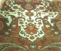 新疆地毯产于乌鲁木齐,采用当地的优良异质半粗毛羊的羊毛为原料。此种羊毛毛质纤维粗,强力大,富有弹性,宜织造,光泽如丝,染色鲜艳,色彩固着力强,长久不变。制作时,先将羊毛捻成毛纱,以“Z”向加捻(即反手),再染色;然后根据需要将毛纱合股,分别用做经线、地纬、绒纬(俗称纸头);最后织毯时将一组经线与上下交织成平纹式的基础组织,再将经过染色的绒头按一定程序拴结于基础组织的经线上,以此显示出地毯的不同色彩与图案纹样。在图案设计上,新疆地毯吸收东西方文化艺术与宗教艺术的精华,具有独特的民族风格,图案端庄典雅,有强烈的装饰性。