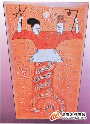 新疆吐鲁番阿斯塔那古墓出土的伏羲女娲绢画。(国新提供)