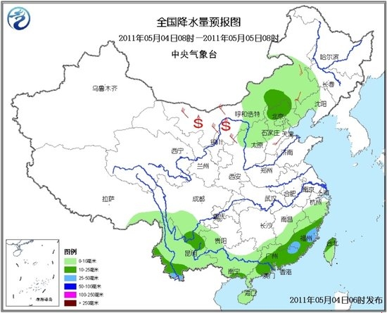 5月4~6日,我国内蒙古中东部、东北大部及长江以南大部地区有小到中雨或阵雨天气,其中,福建东部和西南部、云南南部等地的局部地区有大雨;上述部分地区并伴有短时雷雨大风冰雹等强对流天气。内蒙古大部、西北地区东部、华北、东北地区等地有4~6级风;新疆南疆盆地,内蒙古中西部、宁夏北部、甘肃西部、陕西北部、山西北部等地的部分地区有扬沙或浮尘天气,局部地区有沙尘暴。