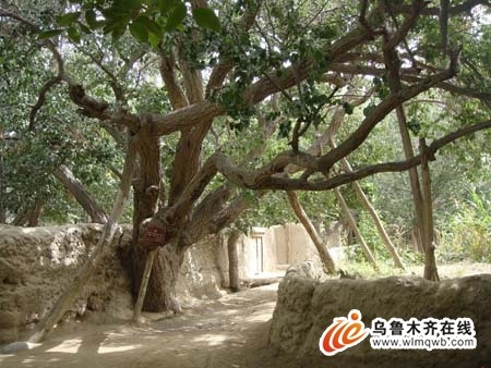 前方扬起尘土,从不远处的老杏树下过来一位得意的骑毛驴少年。老杏树如一把巨伞伸展着枝桠,林业专家测算已有250多年的树龄。虽然高龄,老杏树仍然每年结果儿,村民怕老枝撑不住果实,用木桩支起枝桠,谁也没想过一棵杏树能活这么久。几百年来,台斯村村民一直悉心照顾着它,也一直享用着它结出的甘美果实。