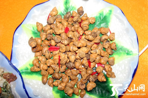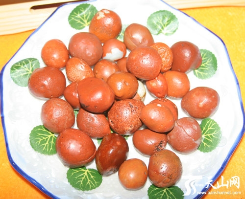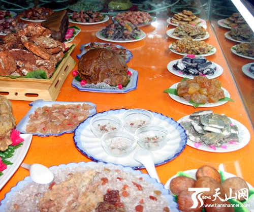 记者在现场看到,“石头宴”摆放着“烤羊排”、‘哈密枣’、“羊肉抓饭”等颇具新疆特色的“风味佳肴”,这些“佳肴”多用出自哈密和鄯善的玛瑙石和火山岩等“做”成。(天山网)