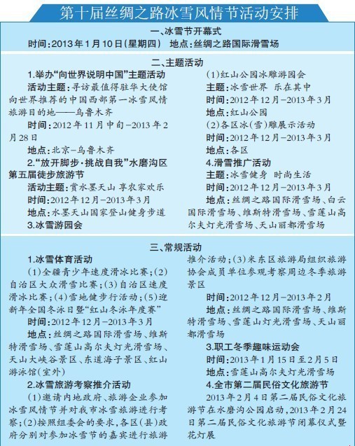 第十届丝绸之路冰雪风情节将于2013年1月10日在丝绸之路国际滑雪场举行。