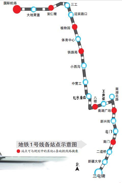 据了解,乌鲁木齐市地铁1号线全长约27.6公里,全部为地下线,2018年底有望通车。线路南起三屯碑,终点位于国际机场。
