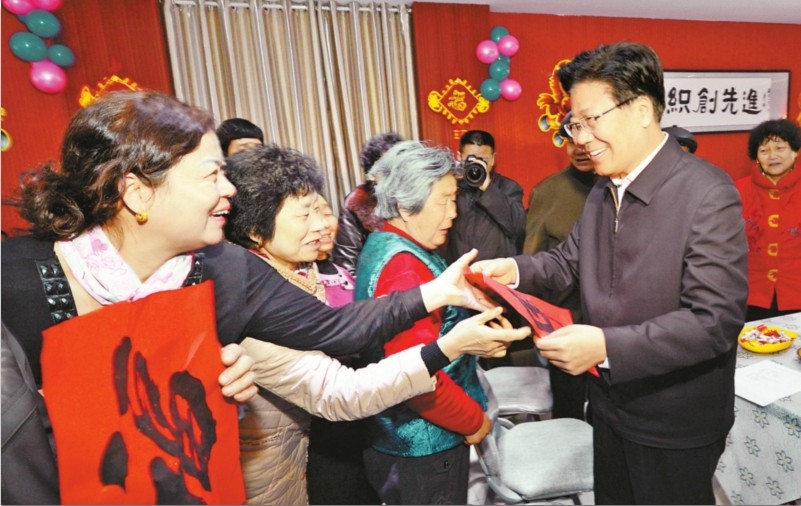 走进城关镇良繁村村委会,各族村民正在这里举行“幸福大团圆、欢乐过大年”春节联欢会。小广场上舞狮、旱船闹得正欢,活动室里,“乡村春晚”更是笑声一片。张春贤兴致勃勃地与村民们一起看起了大家自排自演的节目。舞蹈《幸福的日子扭着过》,快板《说唱农村新变化》,新疆曲子说唱《十唱阜康》,表达了各族乡亲对党的感激和对新生活的赞美。张春贤向乡亲们献上红红的“福”字,祝愿大家马年吉祥,心想事成,日子越过越红火!