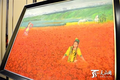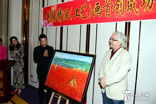 当日,在新疆精油工艺画首创成功发布会现场,记者见到了一幅巨大的新疆精油工艺画,和普通油画不同的是,靠近这幅画,就能闻见浓郁的玫瑰花香,和油画中的大片玫瑰花田相映成趣。