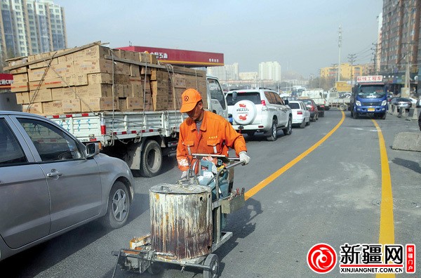 11月4日,在雅山路(燕南立交-仓房沟路段),施工人员正在施划标志标线。
