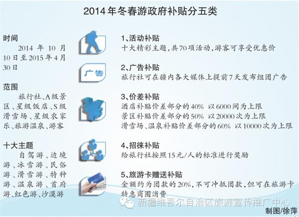 11月13日-14日,自治区旅游局召集新疆旅游企业代表,详解2014年冬春游政府补贴的发放政策,据了解,此次补贴金额总数为3000万元,补贴时限为2014年10月10日至2015年4月30日。