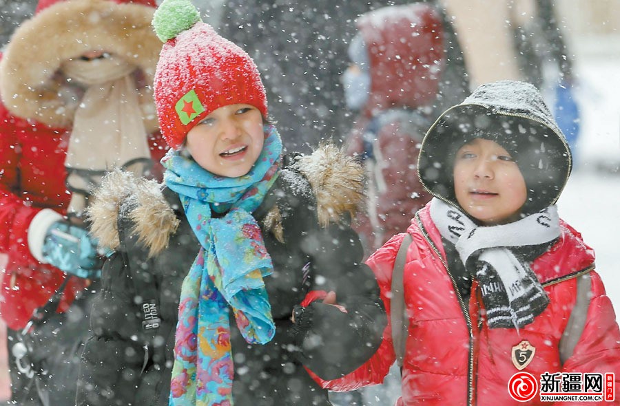 12月8日15时35分,在中山路,走在雪地上的两名小朋友挽着手,以防滑倒。【视频】