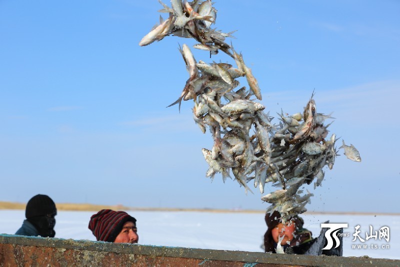 12月22日拍摄的新疆乌伦古湖冬捕场面