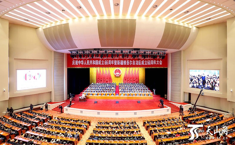 金秋十月,天山南北处处洋溢着热烈喜庆的节日氛围。在乌鲁木齐,新疆人民会堂前广场上鲜花吐艳、彩旗招展;大厅里,习近平总书记题词的“建设美丽新疆共圆祖国梦想”贺匾格外醒目。前来参加庆祝大会的各族各界干部群众代表或身着鲜艳的民族盛装,或身着笔挺的行业制服,先进模范代表佩戴闪闪发亮的奖章、身披大红绶带意气风发。他们中有工人、农民、驻疆部队和武警官兵,还有公安民警、机关干部,都是各行各业的佼佼者,是祖国西部这片热土建设与发展的参与者、见证人。在今天这个历史性的喜庆日子里,自豪喜悦写在每个人的脸上,欢声笑语在会场回荡,大家从四面八方汇聚到这里,共同庆祝盛大的节日。