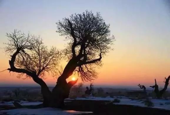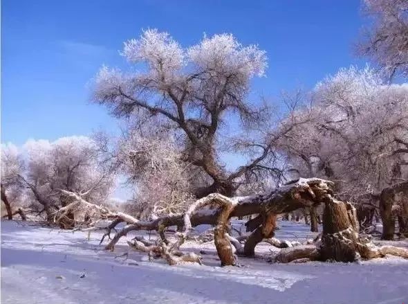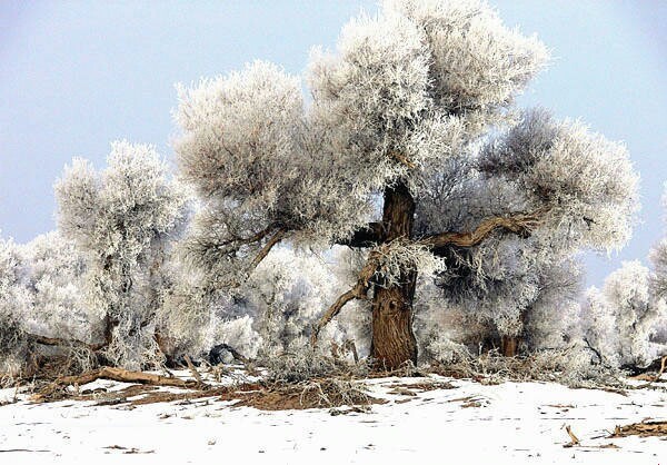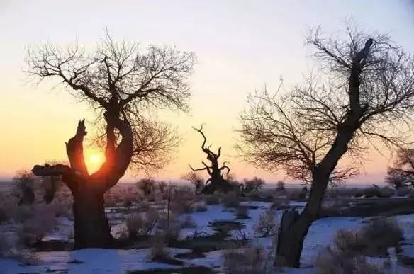 冬日里的胡杨,抖落了一身曾经灿烂的华袍,将满腔燃烧的热火埋进根底,任凭冰雪压枝,依然挺拔傲立。