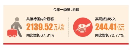 新疆今年一季度,全疆共接待国内外游客2139.52万人次,同比增长67.31%;实现旅游收入244.41亿元,同比增长72.77%,一举实现“开门红”。新疆日报记者/任江