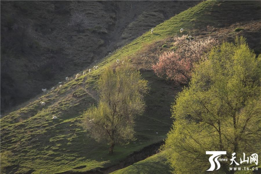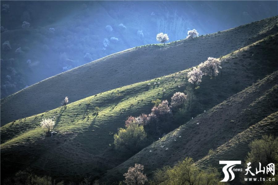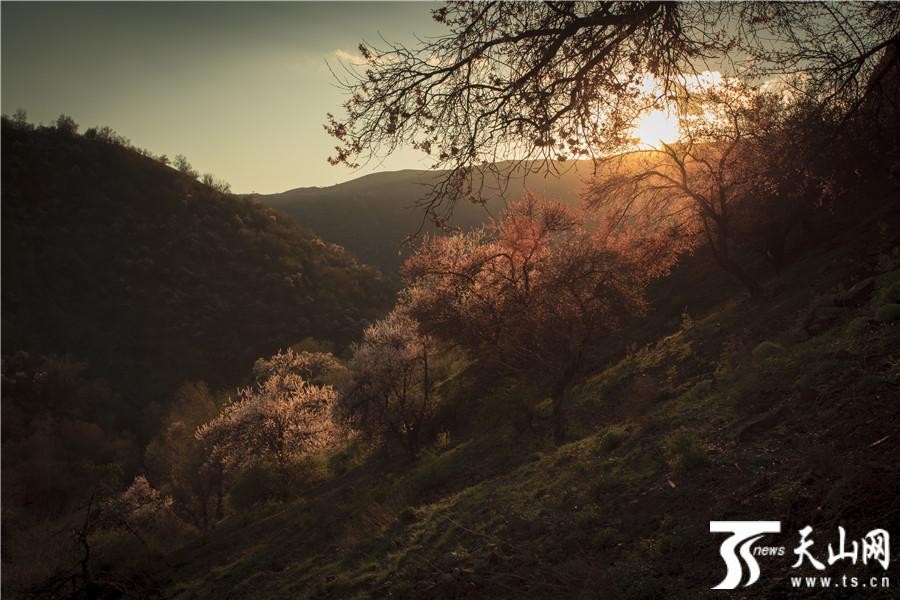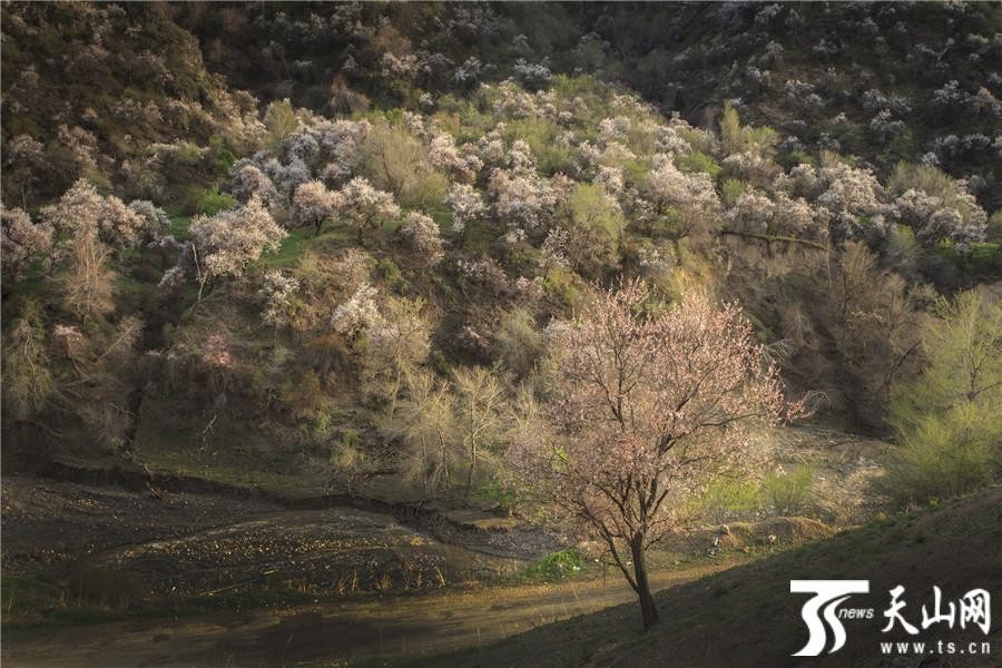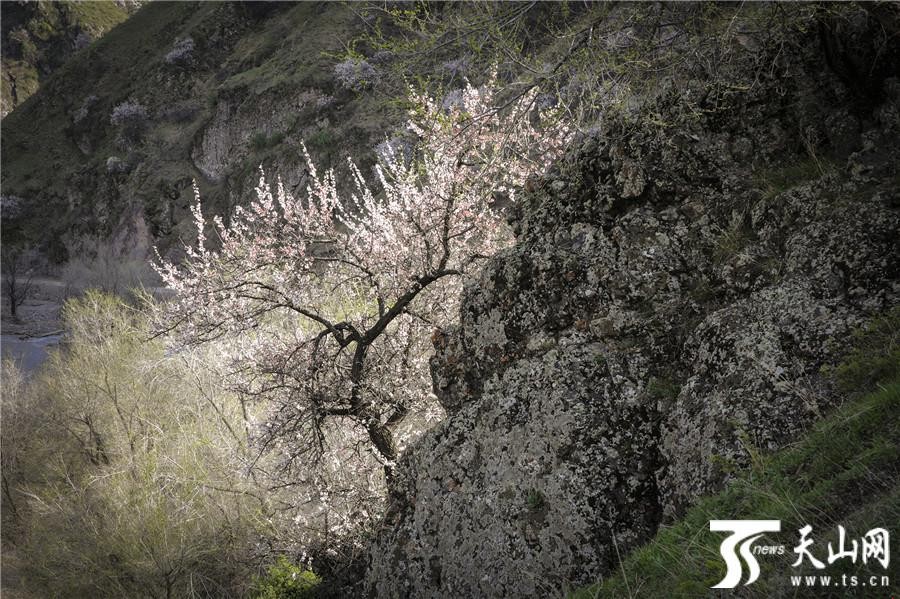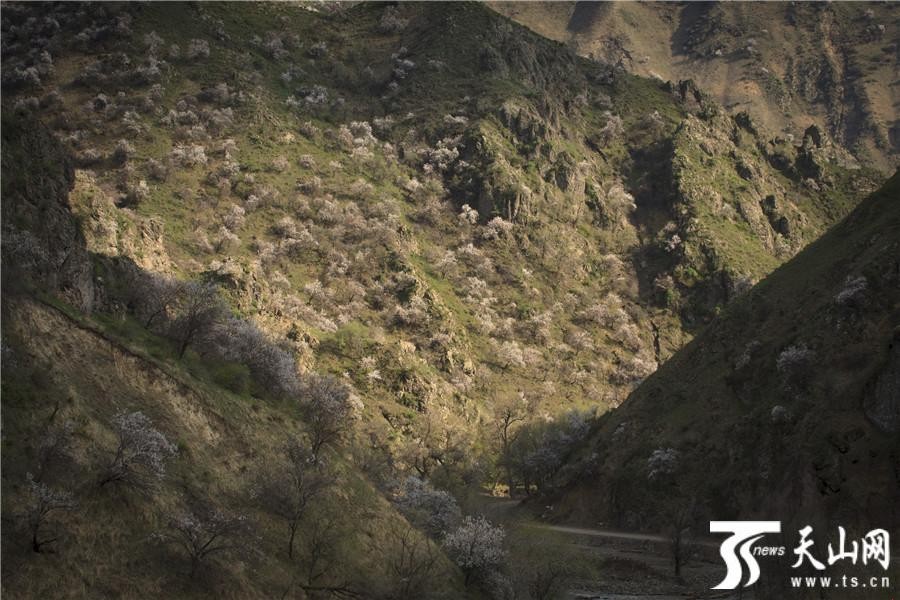 天山网讯(通讯员袁玉龙 冯兰摄影报道)2019年4月13日拍摄的新疆伊犁哈萨克自治州伊宁县阿吾赞沟森林公园山坡上绽放的野杏花。阿吾赞沟是科古尔琴山中的一条美丽的山沟,春天沿着山沟中的吉尔格朗河一路向北,就能看到山坡上野杏花高低错落怒放,春风中杏树在山坡上一棵棵挺立,杏花香气四溢,透过阳光闪闪发光,美不胜收,让人心花怒放,忘记一切烦忧。