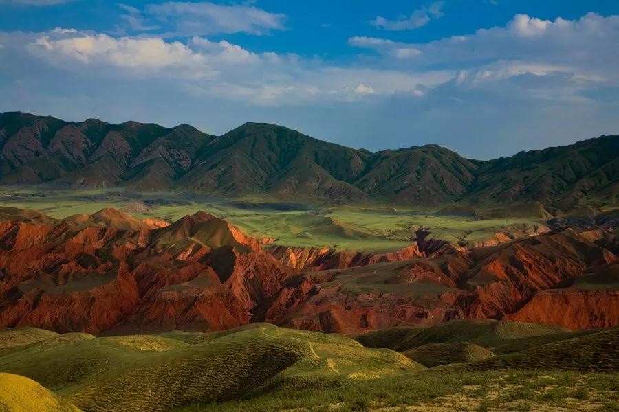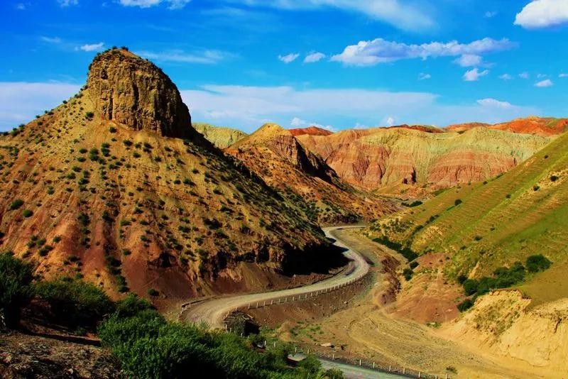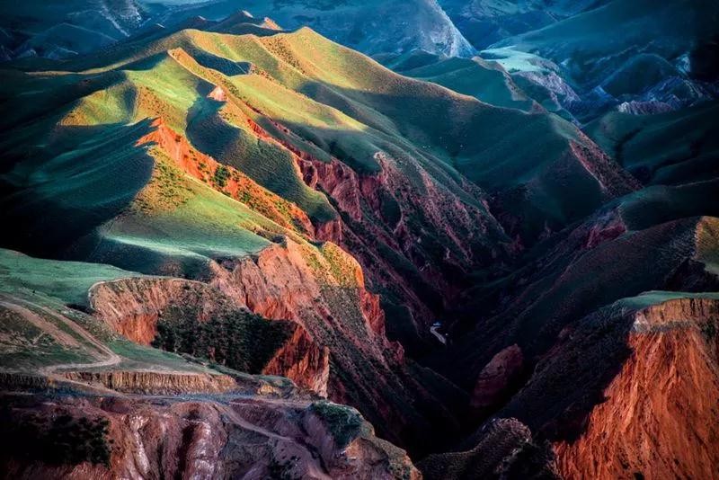在这里,峡谷的色彩随着四季轮转与日升日落而变化,春夏季,峡谷呈现红色、土黄、黄色、绿色。这是因为在千百万年的地质变化过程中,努尔加大峡谷里沉积的红色岩层被水切割侵蚀,形成了气势磅礴的红色山块群。山峦平台面上的绿荫,在毫无遮挡的阳光下肆意挥发。