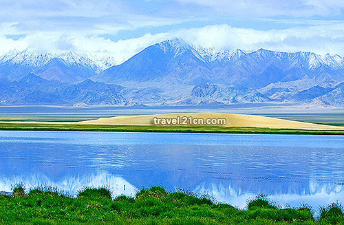 到阿雅克库木湖时已经是下午六点钟了。阿雅克库木湖附近的风光非常美丽,湖背靠山,面向草甸,湖边围了一圈因为湖水蒸发而形成的纯白色的盐碱堆。湖水清澈透明,既有翡翠般的绿色,更有硫磺般的红色,红绿交错,令人惊叹。但阿雅克库木湖的美并不带有生动活泼的色彩,它美得有点阴森。通常情况下,人们不能接触到湖水,因为与湖水连接的是一片深不可测的沼泽地,湖里几乎没有鲜活的鱼儿。据说,偌大的湖只有一个缺口能让人接触到湖水,可一旦把腿伸进湖水里,再提上来时,疽虫就会爬满腿部,非常恐怖。