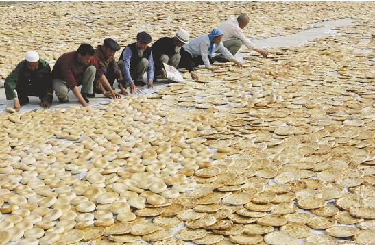 5月17日,哈密市维吾尔族群众在晾晒“赈灾馕”。连日来,哈密地区为支援四川地震灾区,组织百余家烤馕店加班加点为灾区赶制的2万多个“赈灾囊”于当日21时30分送往四川地震灾区。(朱正华摄)