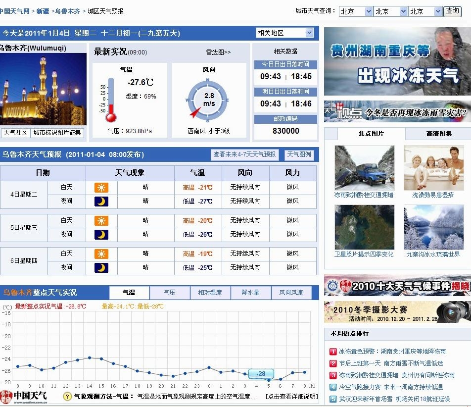 2010年1月4日晨乌鲁木齐零下28度 突破历史低温极值。乌鲁木齐有气象记录以来,同期最低气温为-27.7℃,出现在1967年。