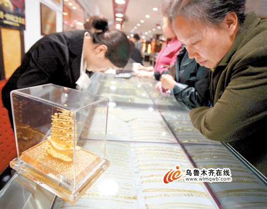 中秋小长假乌市黄金销售量看涨。据乌鲁木齐恒久钻石负责人介绍,该店黄金饰品销量增加4成。图为:25日,消费者在恒久钻石黄金专柜挑选黄金饰品。(记者陈岩摄)