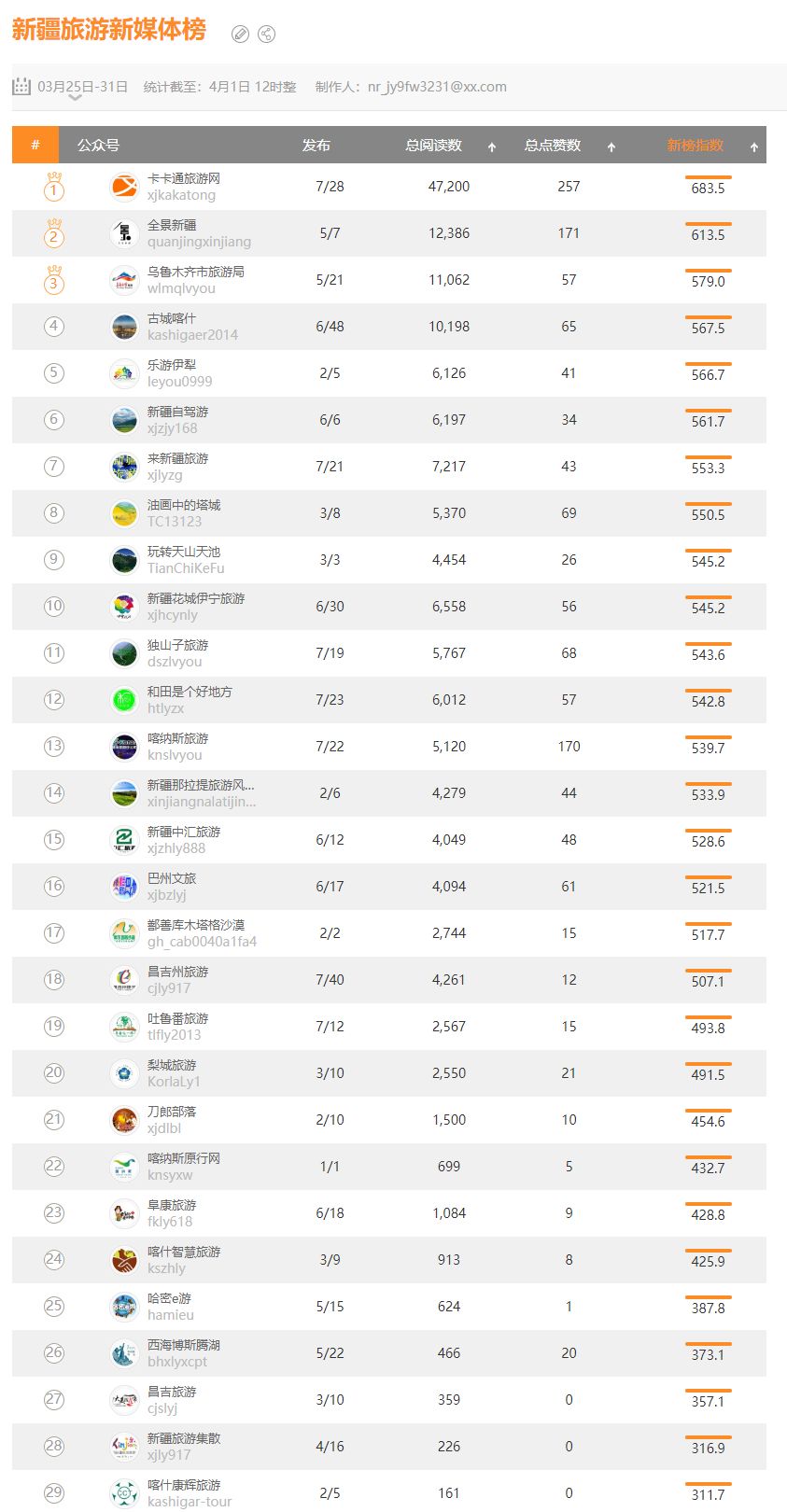 “乌鲁木齐市旅游局”,看过内容分析不难发现,该平台在内容选取上更符合大众阅读口味,实用有趣、风格简约,在长期微信端的努力也让其终于登上了前三的宝座,恭喜它!